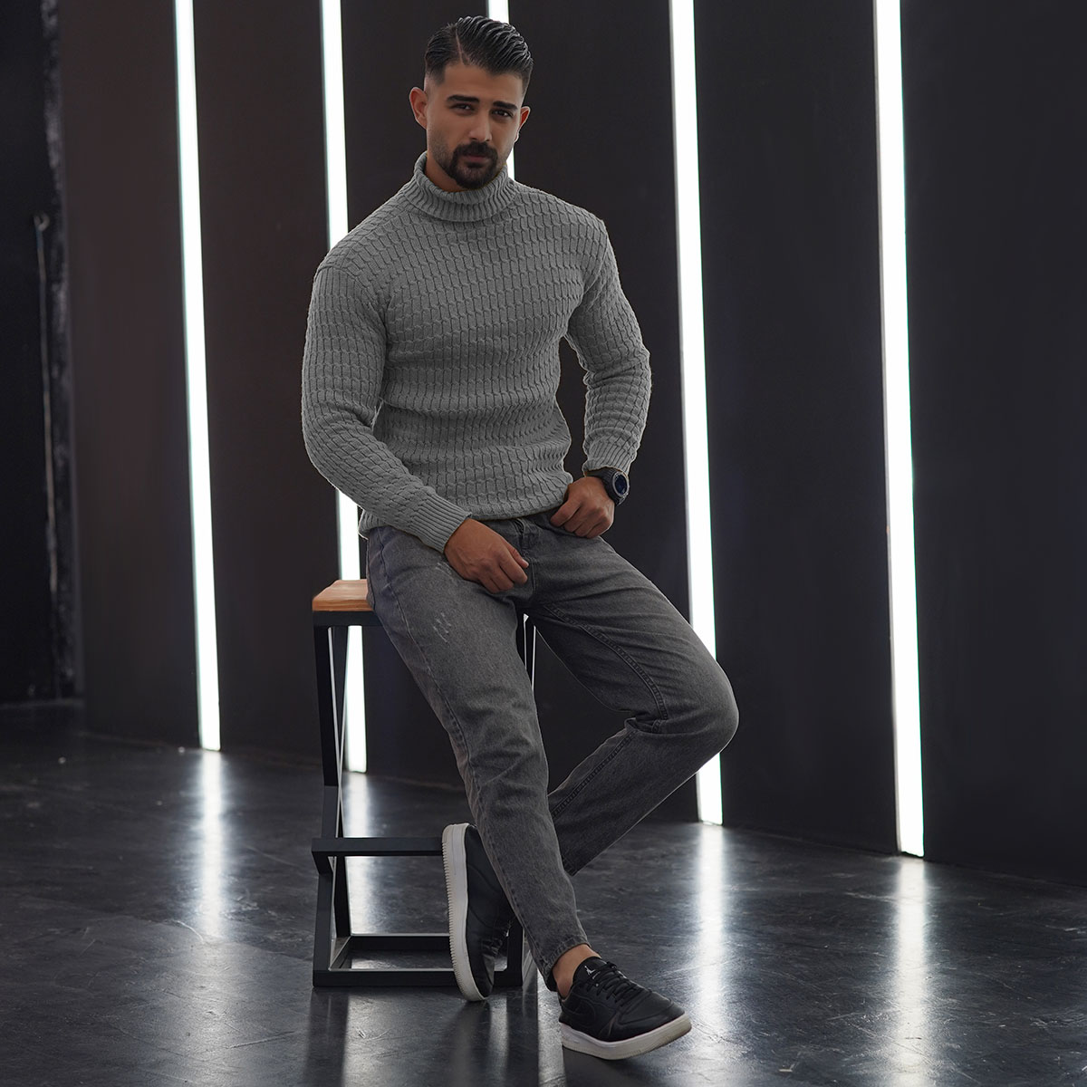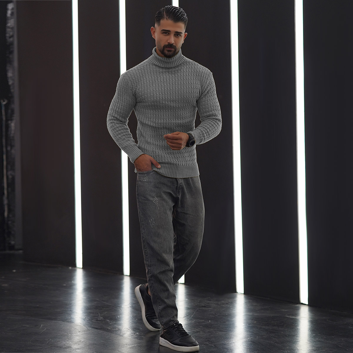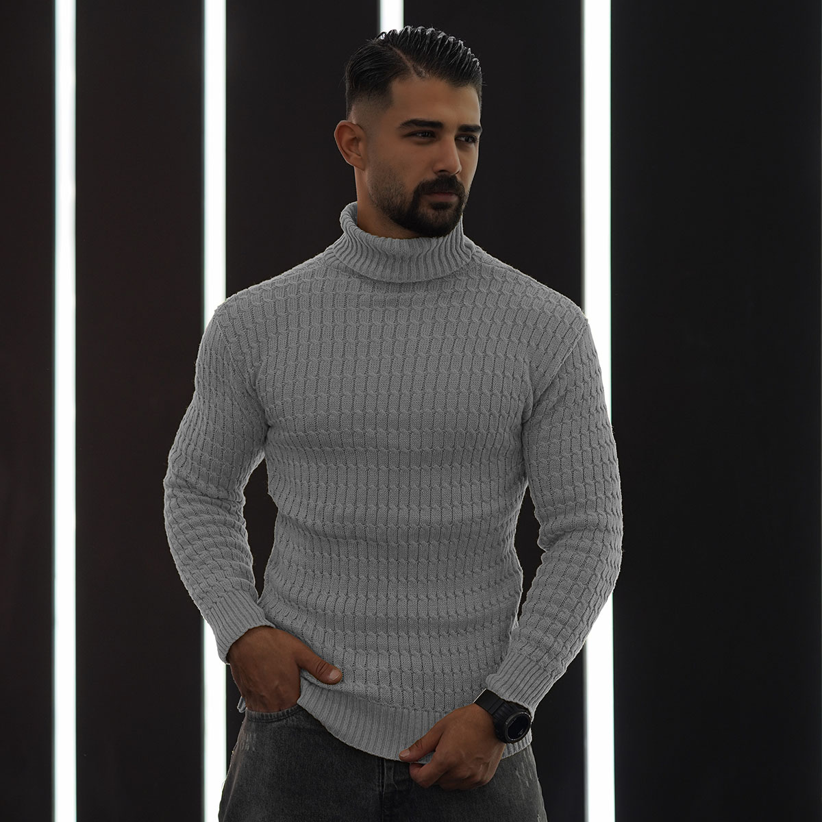 پلیوربافت مردانه طوسی یقه اسکی مدل Pouyan