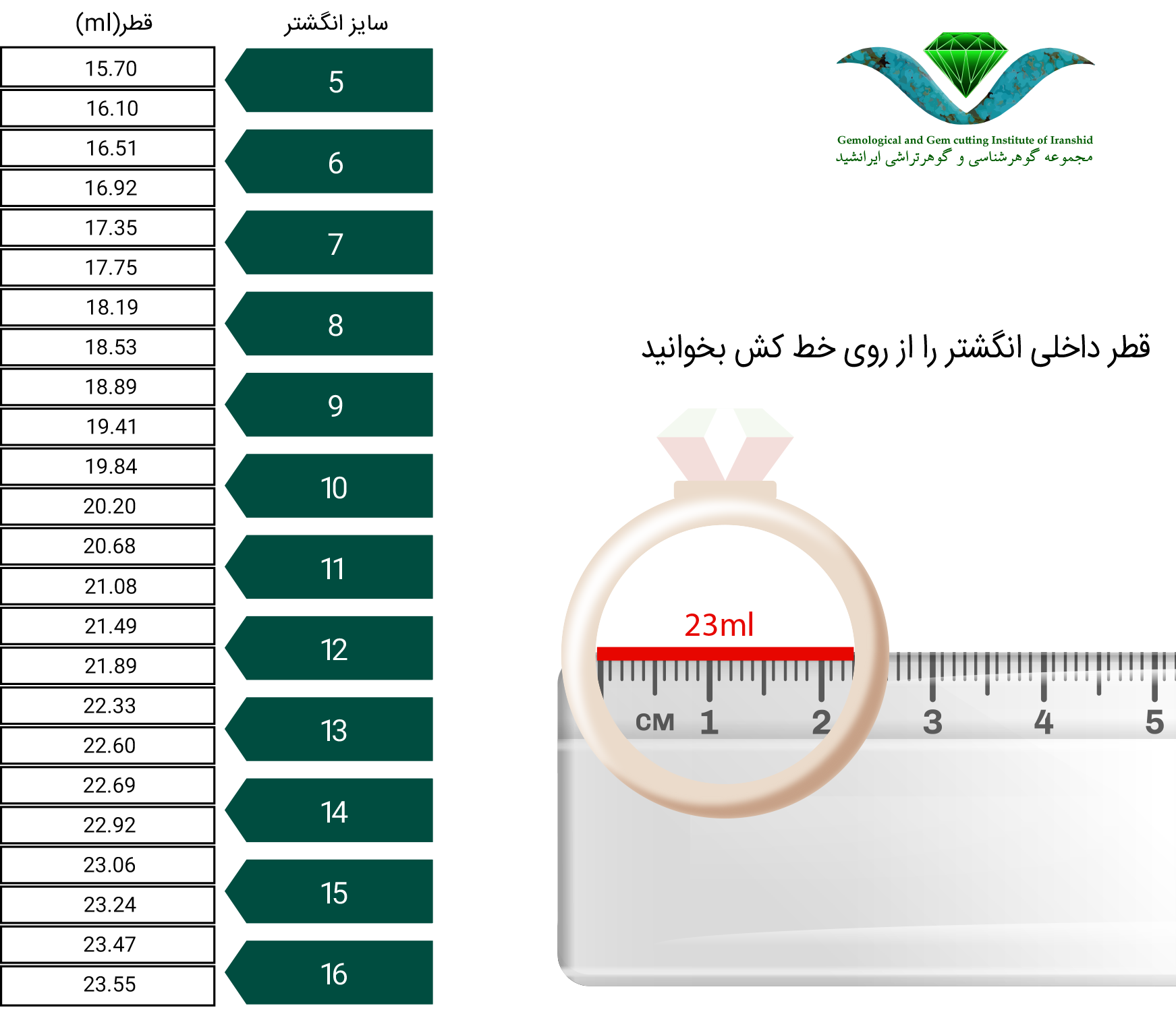 حال محل علامت گذاری شده را روی یک وسیله اندازه گیری مثل خط کش قرار دهید. با این کار محیط انگشتر شما برحسب میلیمتر بدست آمده است و می توانید برای بدست آوردن سایز استاندارد از جدول راهنما استفاده نمایید.